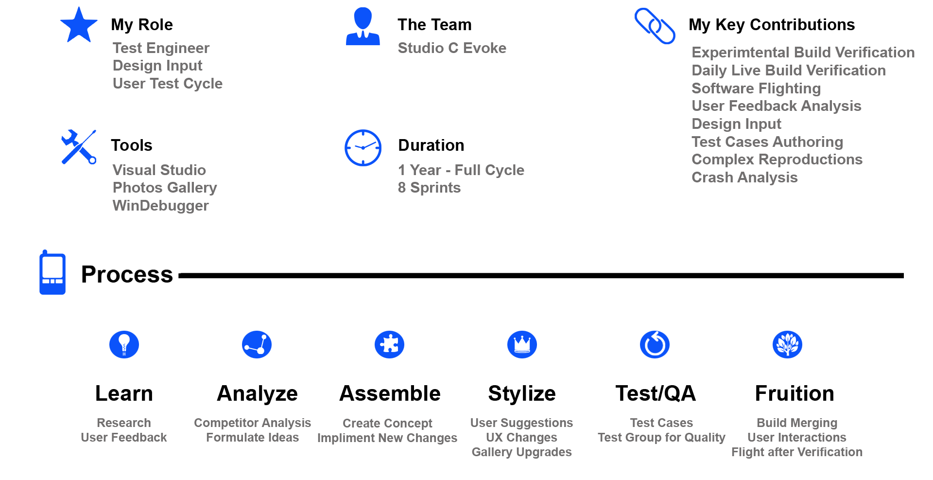 As Designers and Engineers implemented new functionalities, I began to notice there was a difficulty in sorting large amounts of images while working in the Photos! Gallery during my test patterns. I found myself scrolling for long periods of time, as I browsed thousands of images for my Testing Metrics. I referred back on my User Feedback Metrics and located other Users with the Feedback Hub with similar experiences. I knew my design implementation would have a large amount of impact on Users, so I sketched my concept and presented my idea.